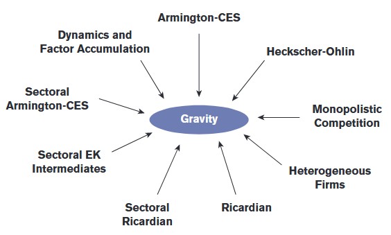 Arkolakis et al.(2012)的突破性研究重新激发了学术界对引力模型的关注,该研究证明多种理论模型均可推导出相似形式的引力方程,且均能保持贸易利得。如 图 1.1 所示,贸易利得在以下微观基础模型中均呈现出不变特征:垄断竞争经济模型(Anderson,1979;Anderson & van Wincoop,2003);赫克歇尔-俄林框架(Bergstrand,1985;Deardoff,1998);李嘉图模型(Eaton & Kortum,2002);异质性企业市场选择模型(Chaney,2008;Helpman et al.,2008);单部门Armington模型(Anderson & Yotov,2016);部门李嘉图模型(Costinot et al.,2012;Chor,2010);基于Eaton-Kortum框架的部门投入产出关联模型(Caliendo & Parro,2015);以及包含资本积累的动态框架(Olivero & Yotov,2012;Anderson et al.,2015;Eaton et al.,2016)。最近,Allen et al.(2014)的研究,证明了广义一般均衡贸易模型中均衡解存在性与唯一性的充分条件,确立了引力模型的普适性理论地位。